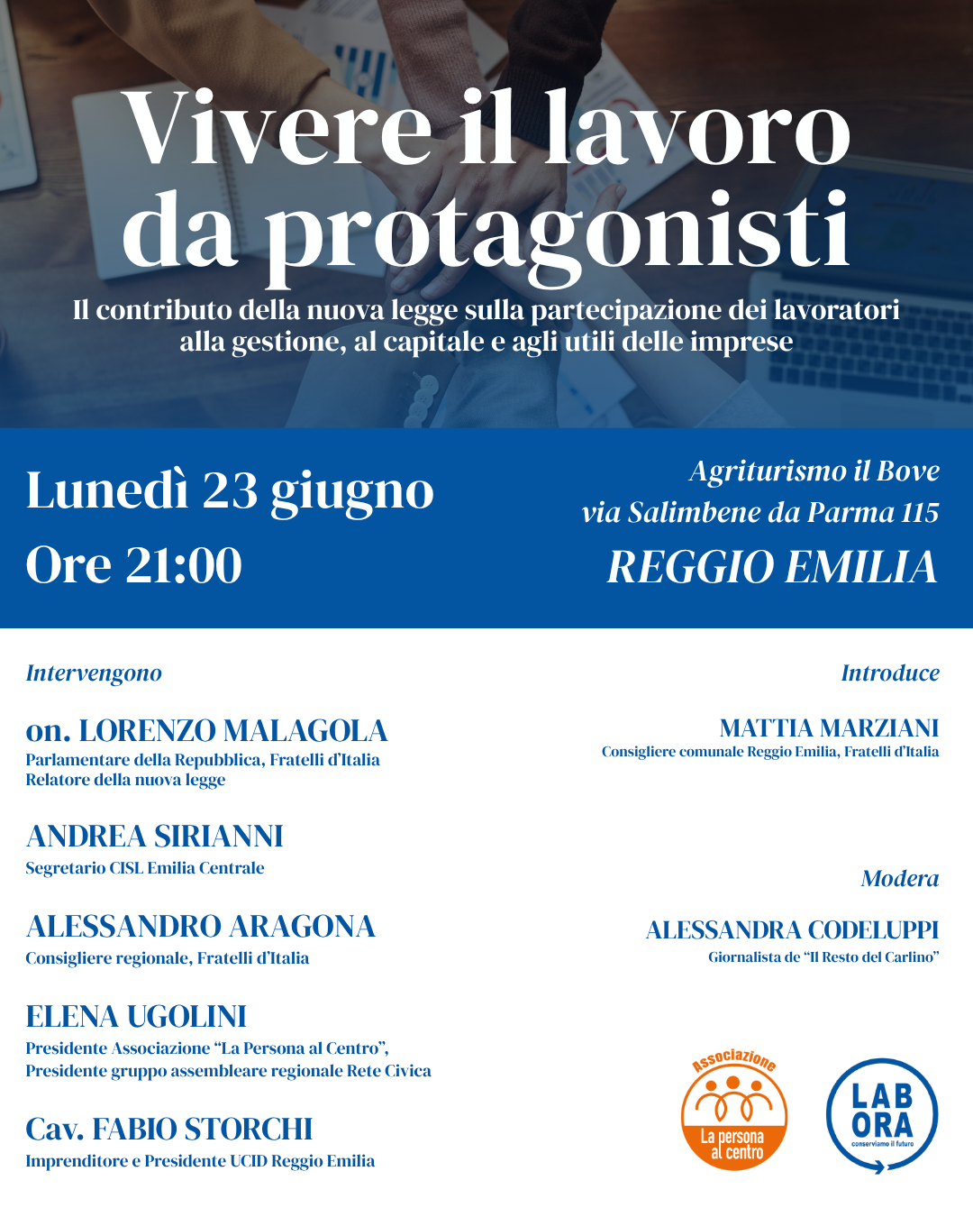 Lunedì 23 giugno all’Agriturismo Il Bove di Reggio Emilia dinanzi a 150 persone si è tenuto l’incontro dal titolo “Vivere il lavoro da protagonisti – Il contributo della nuova legge sulla partecipazione dei lavoratori alla gestione, al capitale e agli utili delle imprese“, che ho organizzato con l’associazione “La Persona al Centro” insieme a “LabOra”.